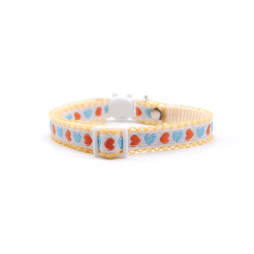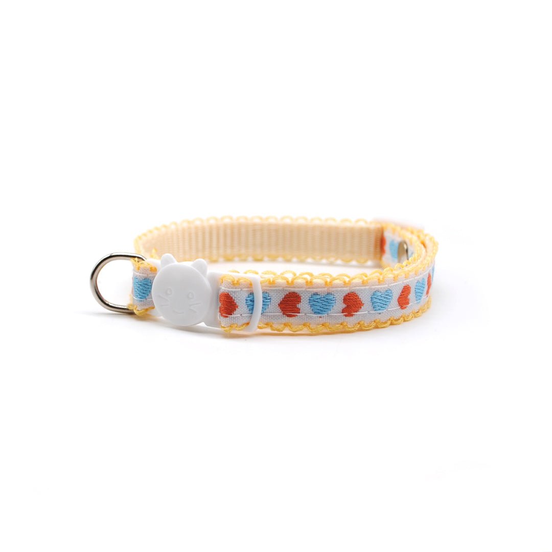 Collar de gato hecho de cinta decorativa bordada y broche anti ahorque plástico para una rápida liberación en caso de quedar enganchado con alguna rama u objeto. Medialuna de metal para poner la placa de identificación.