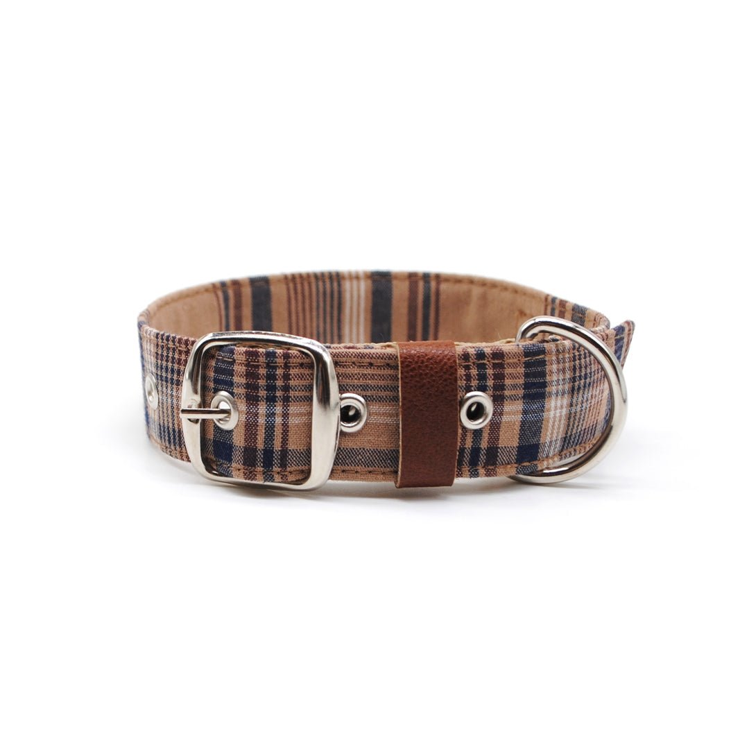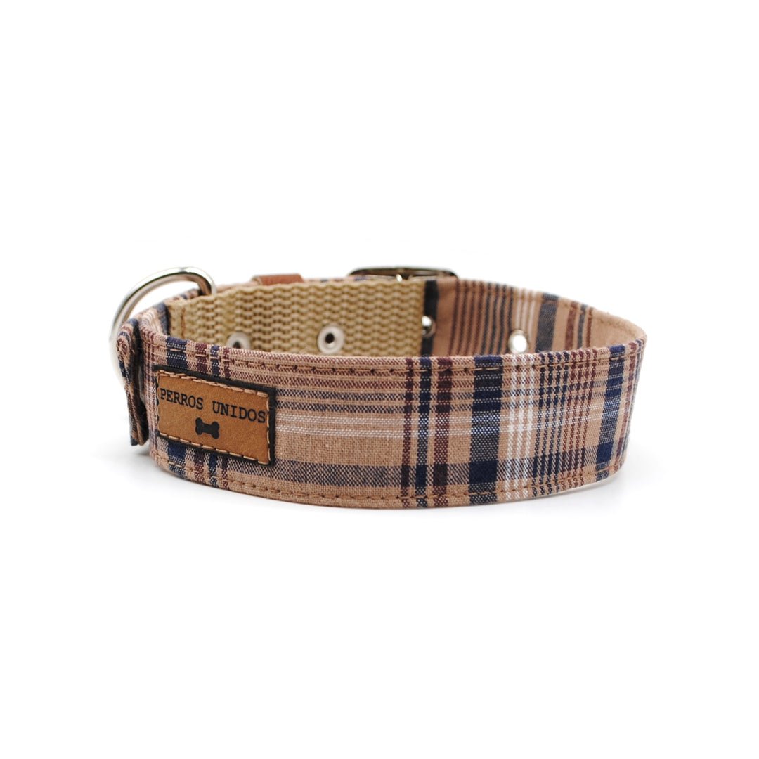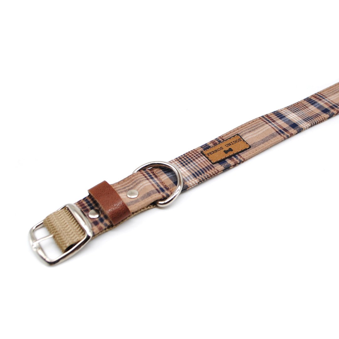 Collar para perros hecho con cinta de polipropileno forrada con tela. Hebilla, medialuna y ojetillos metálicos. Hecho a mano en Chile.