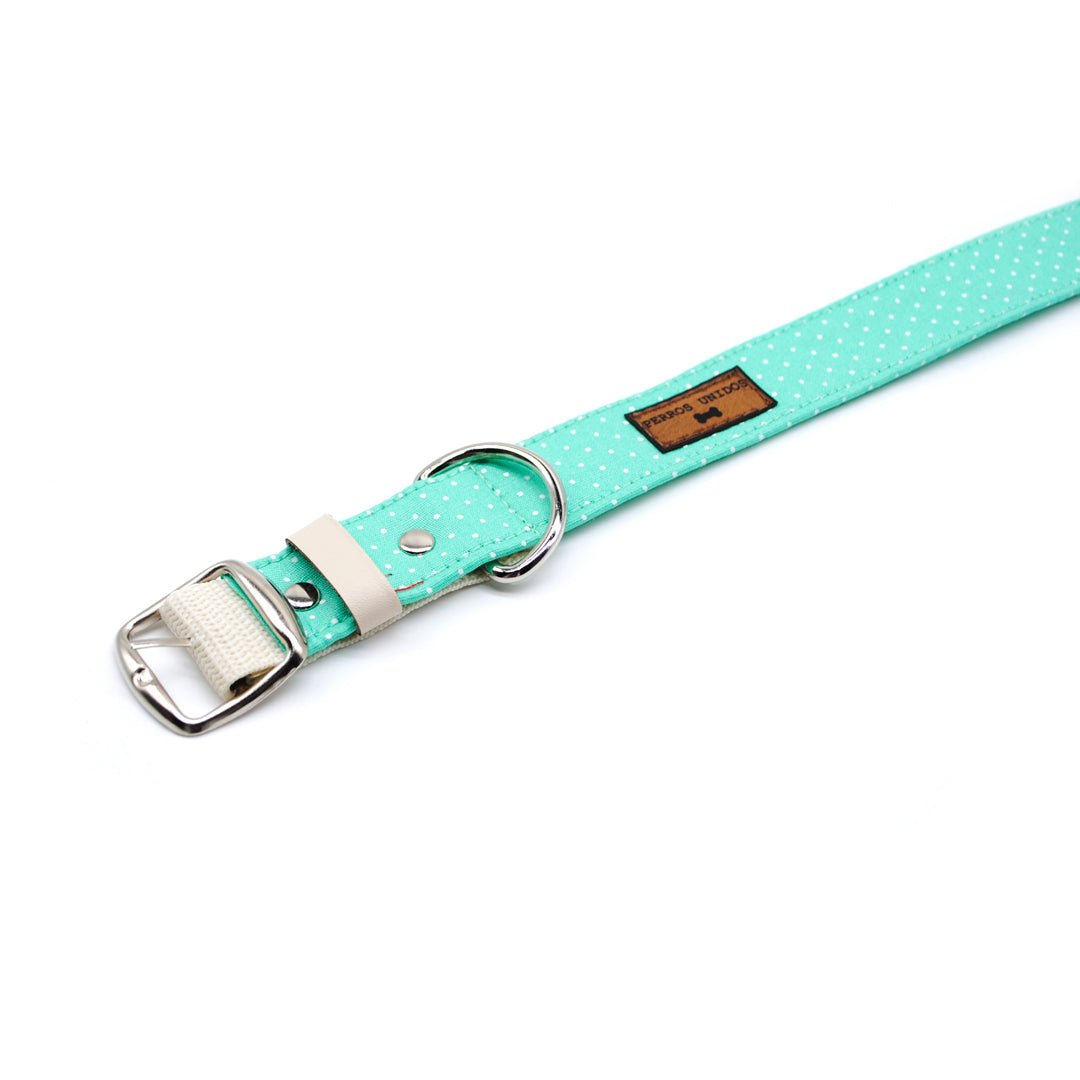 Collar para perros hecho con cinta de polipropileno forrada con tela. Hebilla, medialuna y ojetillos metálicos. Hecho a mano en Chile. Tela 100% algodón.